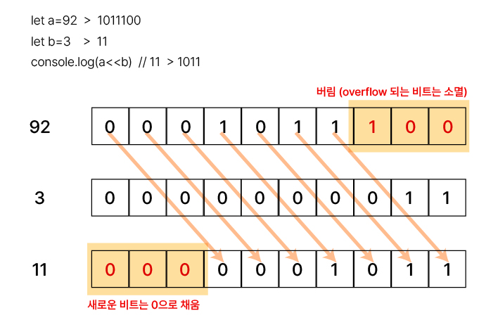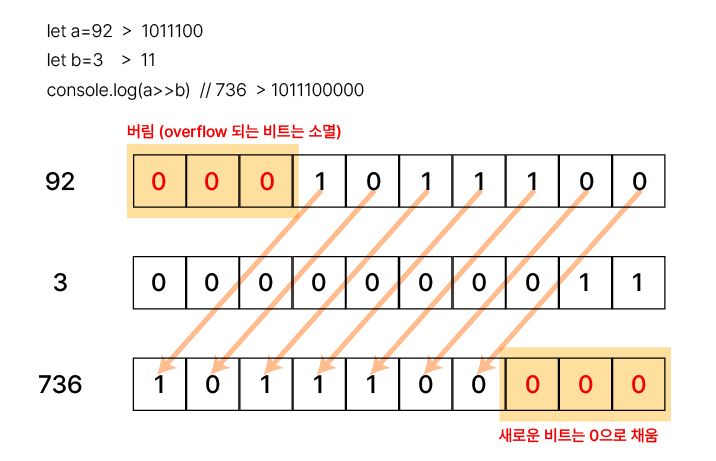 -연산 시 밀려나는 비트는 버려지며, 새로 들어오는 비트는 항상 0