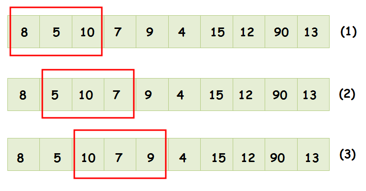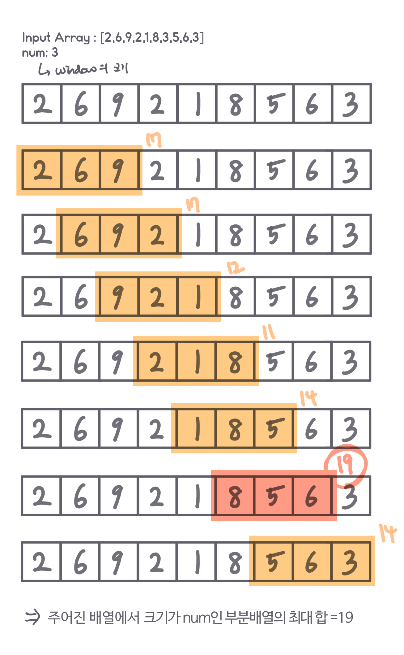 창문이 옮겨간다는 이름의 이 알고리즘 풀이 방식은 고정된 범위(창문)가 자동으로 옮겨가면서(=구간의 길이가 같음) 창문 내에 있는 데이터를 이용해 조건에 해당하는 답을 반환하게 된다. 시간복잡도가 O(n)이다.