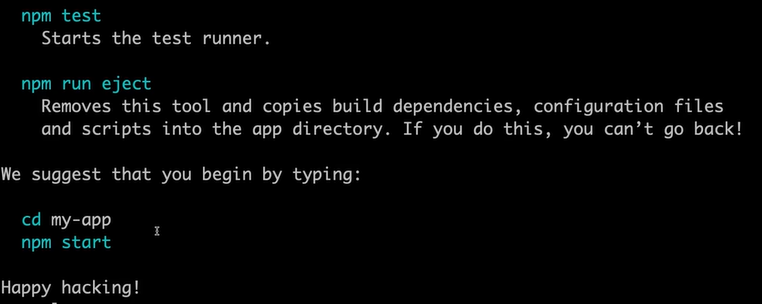 원하는 위치를 cd 명령어로 찾아서 (이 경우 Desktop, 바탕화면에 폴더를 만들어준다) 위 명령어를 실행해주면 자동으로 설치가 진행된다. 설치가 완료되면 Happy hacking! 이라는 텍스트와 프로젝트 시작을 위한 명령어들이 마지막으로 출력된다.
