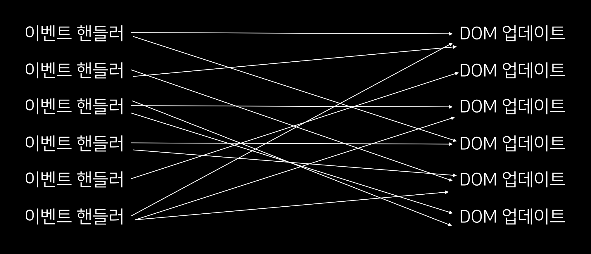 JavaScript를 사용하여 HTML로 구성한 UI를 제어하기 위해서는 DOM의 변경이 필요하다. 브라우저의 DOM Selector API를 사용해 특정 DOM을 선택한 뒤, 특정 이벤트가 발생하면 변화를 주도록 설정해야 하는데, 이를 위해서 DOM 노드를 직접 조작해야 한다. 이런 동작이 크게 발생하지 않는 웹사이트라면 상관 없겠지만, 현대의 웹페이지처럼 다양한 동작이 발생하는 경우에는 코드의 유지보수 및 관리가 어려워진다.