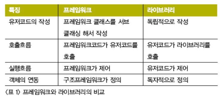 프레임워크와 라이브러리의 특징과 차이를 비교하면 다음 표와 같다.