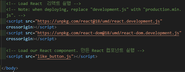첫 두 script는 React를 실행시키고, 3번째 script는 만든 컴포넌트를 실행하는 역할이다.