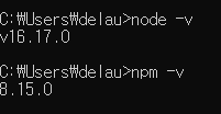 설치 후, 명령 프롬프트나 VS Code 터미널에서 node -v(또는 node --version), npm -v(또는 npm --version)을 치고 실행이 되면 설치가 완료된 것이다.