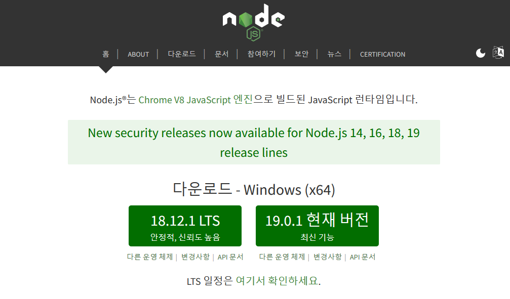 여기서 LTS 는 Long Term Support의 줄임말로, 2년간 해당 버전에 대한 취약점 패치 및 개선 사항에 대한 패치를 보증하는 버전을 의미한다.