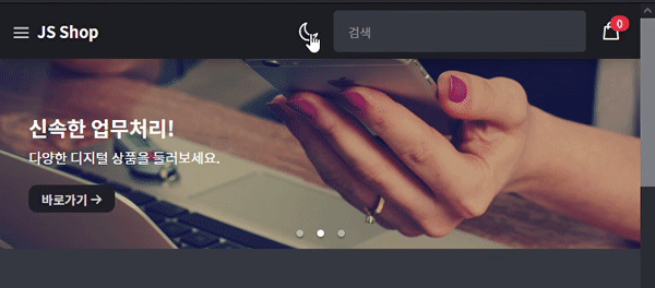 .dark 클래스가 body에 추가되면 body에 다크 모드로 지정한 css가 적용되도록 했고, 클릭 시 버튼 아이콘이 회전하도록 했다. localStorage를 이용해 새로고침을 해도 이전에 설정한 상태가 유지되도록 했다.
